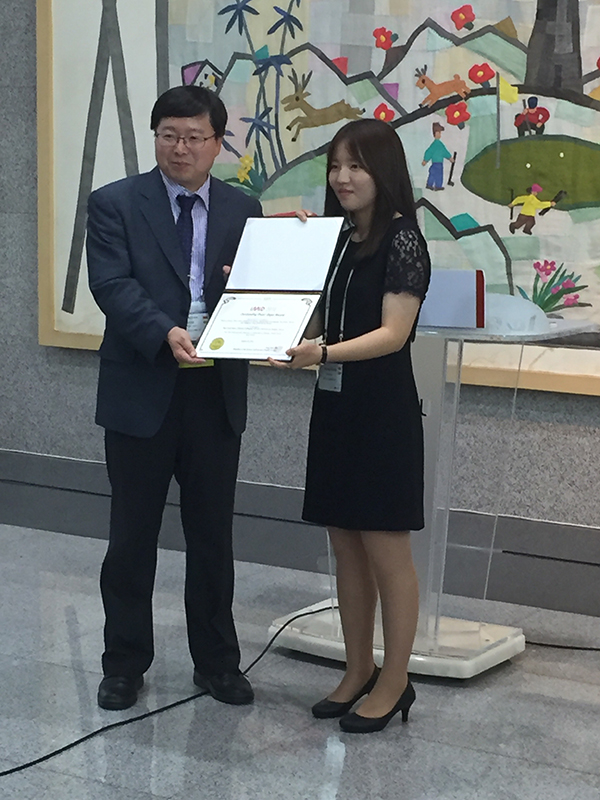 포스텍 전자과 경수정씨(지도교수 정성준) 전자전기공학과 대학원생 경수정 학생이(지도교수 정성준) 지난 8 23-26일에 열린 국제정보디스플레이 학술대회(IMID2016)에서 발표한 ‘High performance 3D organic circuits fabricated by solution-process’ 내용이 우수포스터상을 수상하였다.
