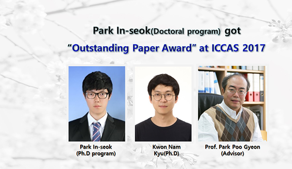 Ph.D student Pak in suk (Advisor: Prof. Park Poo Gyeon) got “Outstanding Paper Award”at ICCAS 2017